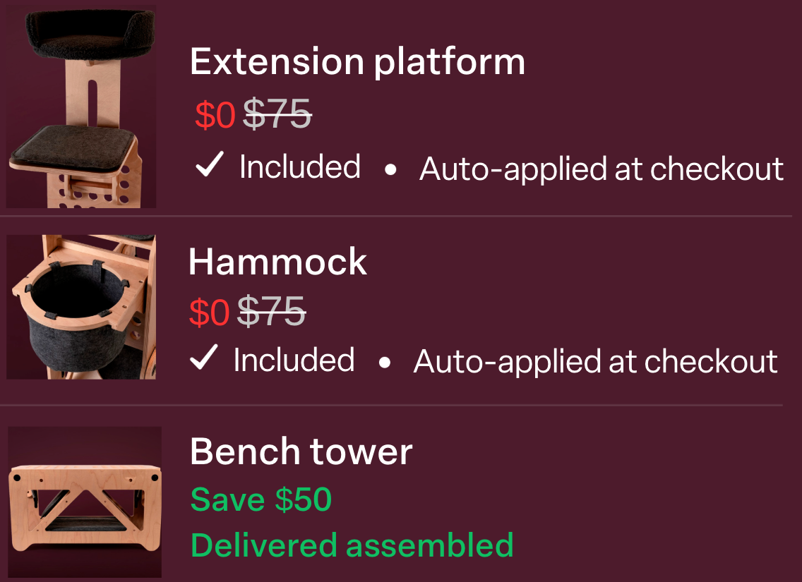 To keep you and your cat secure while using the bench tower as either a bench or a tower, and to make the folding process smooth, we’ve invested heavily in the hardware, including four gas struts in every unit. We had the option to use cheaper parts, but we couldn’t compromise on safety, ease of use, or the aesthetic.
